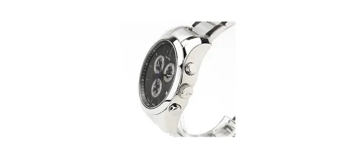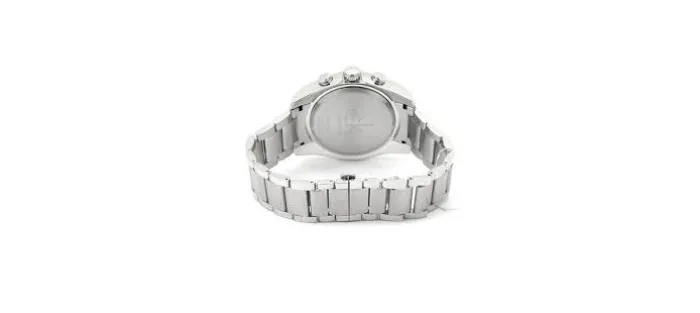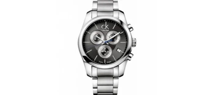 Caja y armis de acero inoxidable 316L hipoalergénico con cierre de mariposa (caja de 45 mm de diámetro). Esfera negra y subesferas blancas, calendario a las cuatro en punto. Corona con logotipo de la marca cK. Resistente al agua 100 metros.