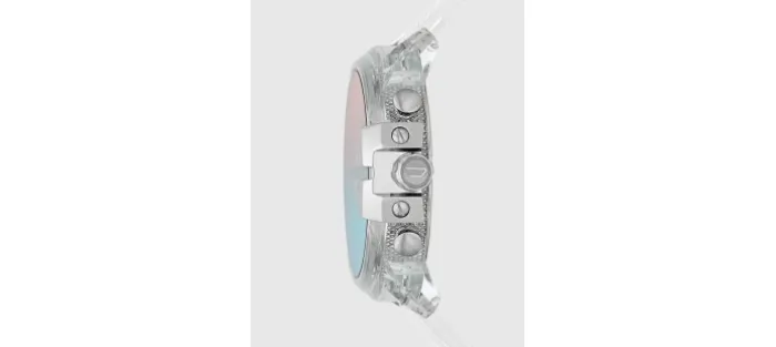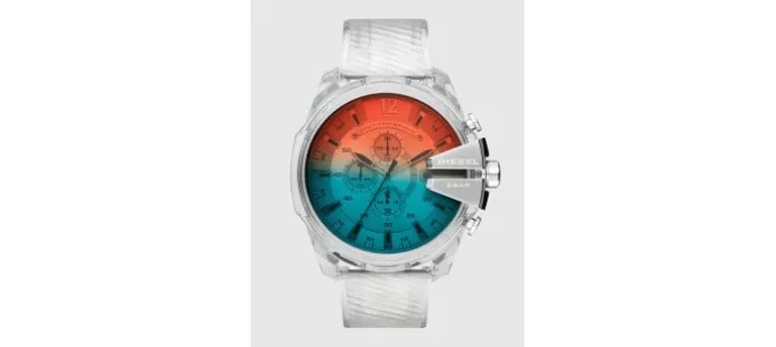 Reloj cronógrafo Mega Chief de Diesel con dial iridiscente, índices blancos, tres subesferas y correa blanca texturizada.