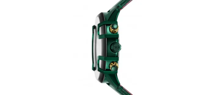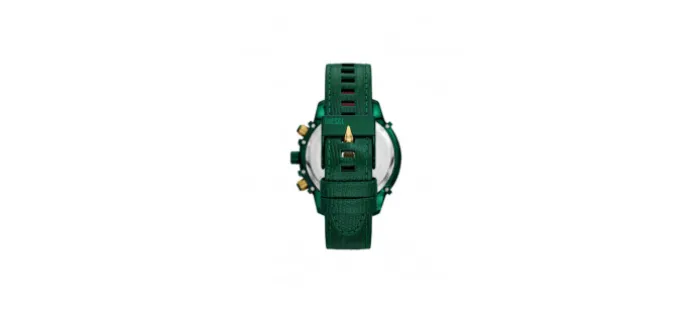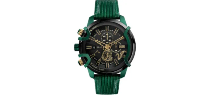 El reloj Griffed de 48 mm de Diesel cuenta con una esfera de color negro mate, movimiento de cronógrafo y correa de cuero verde texturizado.