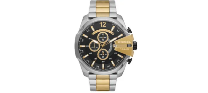 El reloj Mega Chief de 51 mm de Diesel cuenta con una esfera con acabado de rayos de sol color negro, con manecillas bastón, movimiento de cronógrafo y pulsera de acero inoxidable en dos tonos.