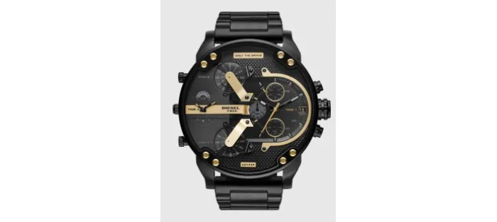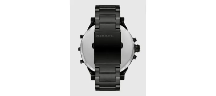 Este reloj cronógrafo Mr. Daddy 2.0 de 57 mm presenta un dial negro con índices alargados y pulsera en acero inoxidable negro.