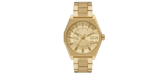 El reloj Scraper de 43 mm de Diesel cuenta con una esfera con acabado de rayos de sol en tono dorado, movimiento de tres agujas y pulsera de acero inoxidable en tono dorado.