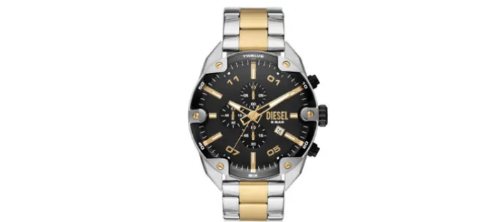El reloj Spiked de 49mm de Diesel cuenta con una esfera de satén negro, movimiento de cronógrafo y pulsera de acero inoxidable en dos tonos.