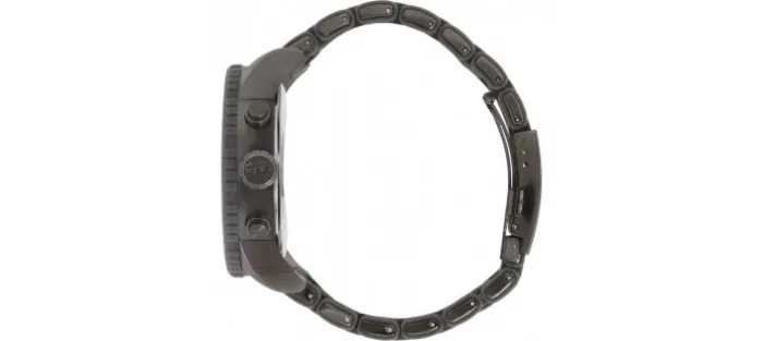 Caja de acero inoxidable de 51 mm de diámetro pavonada en gris oscuro, armis y cierre de seguridad del mismo material (bisel de la caja y eslabones de la cadena cubiertos con caucho gris). Esfera y subesferas en negro y gris con detalle de las saetas de las esferas interiores de color pistacho. Corona con logotipo de la marca. Resistente al agua 50 metros.