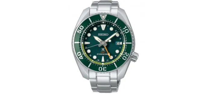 El audaz diseño de 2007, apodadocomo Sumo, se ha modernizado con el nuevo calibre Solar GMT 5K65. Este nuevo movimiento impulsado por la energía solar tiene una reserva de marcha de 9 meses con plena carga. El verde suave de su esfera y de su bisel unidireccional visten este reloj de buceo profesional Prospex con un agradable toque de color naranja de la aguja GMT manteniendo un aspecto sobrio y elegante. La corona de este reloj está atornillada, al igual que su fondo de caja, asegurando la resistencia al agua hasta 200m. Este reloj potente y robusto encarna a la perfección el espíritu de los Diver’s de la colección Prospex.