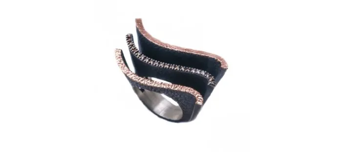 Anillo de plata envejecida de primera ley (925) y oro rosa. En la parte superior lleva engastados 22 diamantes coñac de 1,4mm y con un peso aproxiamdo de 0,35 Quilates.